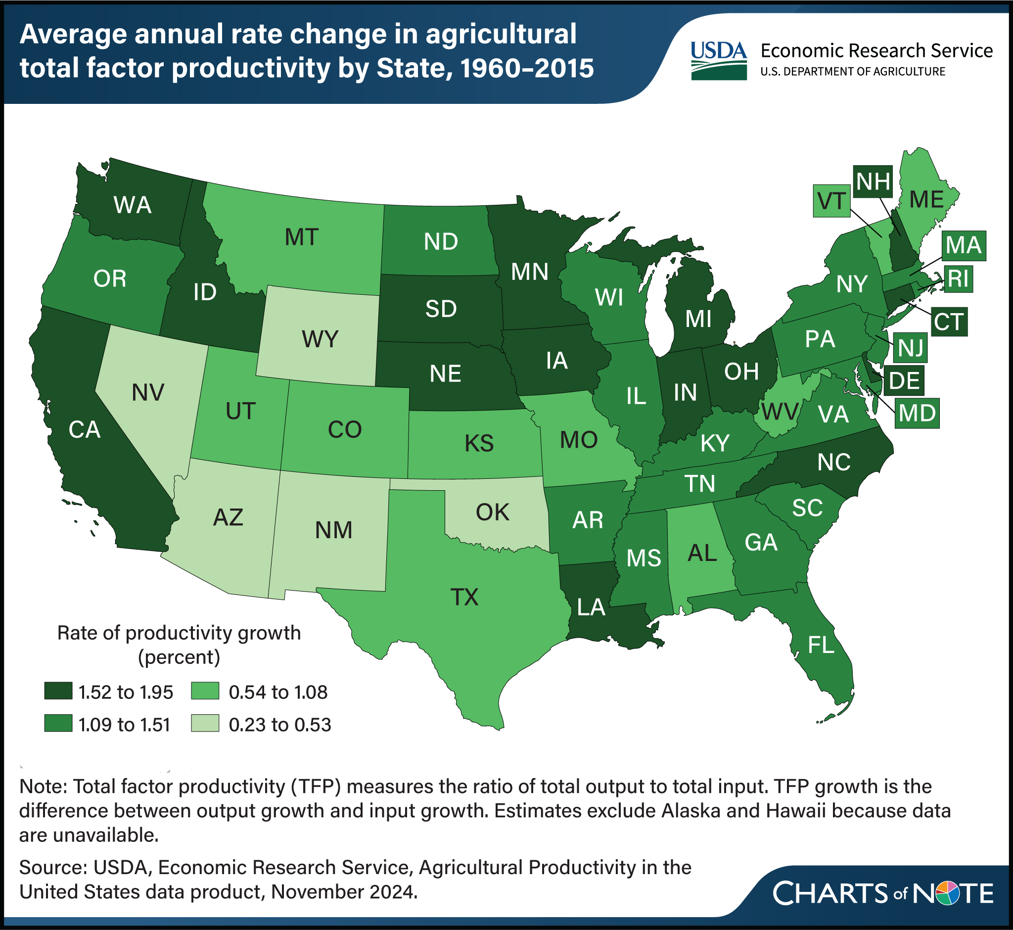 A recent USDA Economic Research Service (ERS) chart illuminates the striking geographic variation in agricultural productivity growth across the United States from 1960 to 2015. The map reveals four distinct tiers of productivity growth rates, ranging from the highest performers (1.52% to 1.95% annually) concentrated in the Midwest, Northeast, and parts of the West Coast, to the lowest performers (0.23% to 0.53%) primarily in the Southwest. States like Ohio, Indiana, Minnesota, Washington, and California led with robust productivity growth, while Nevada, New Mexico, Arizona, and Wyoming experienced significantly slower gains.